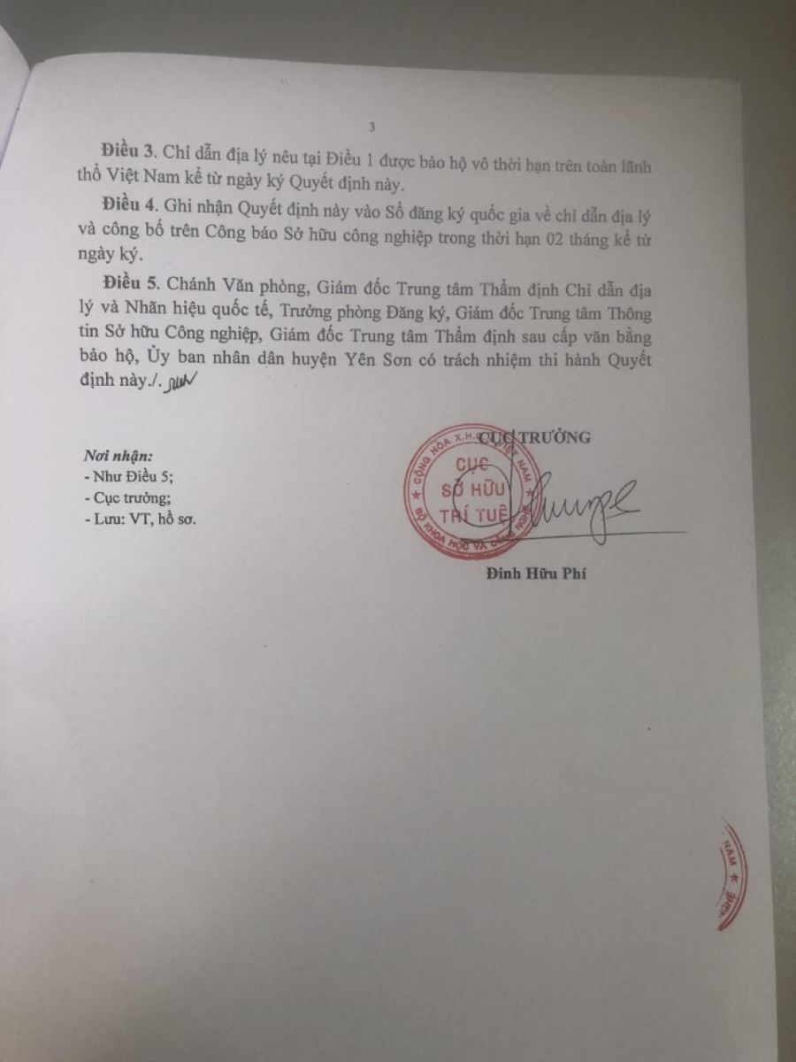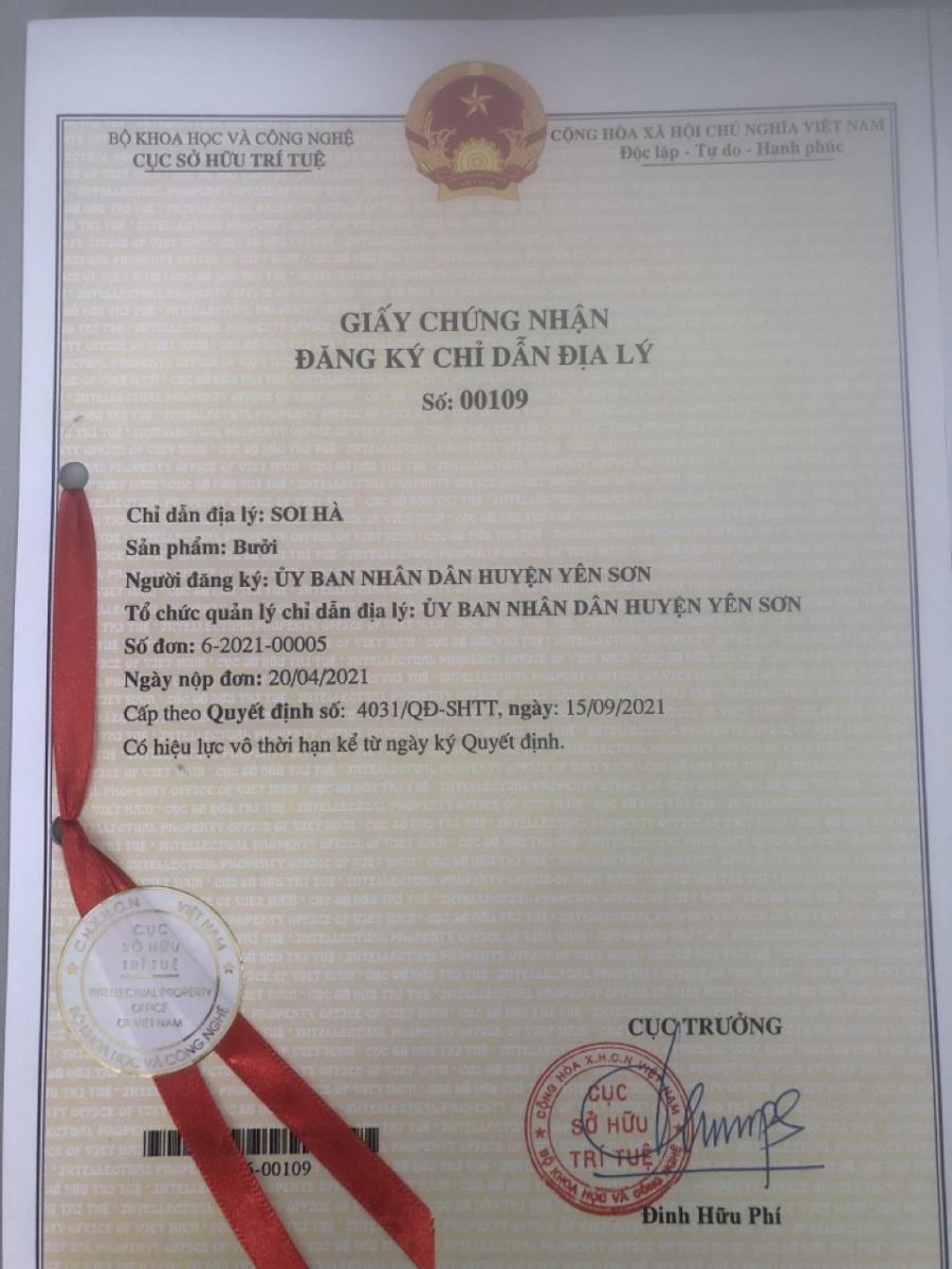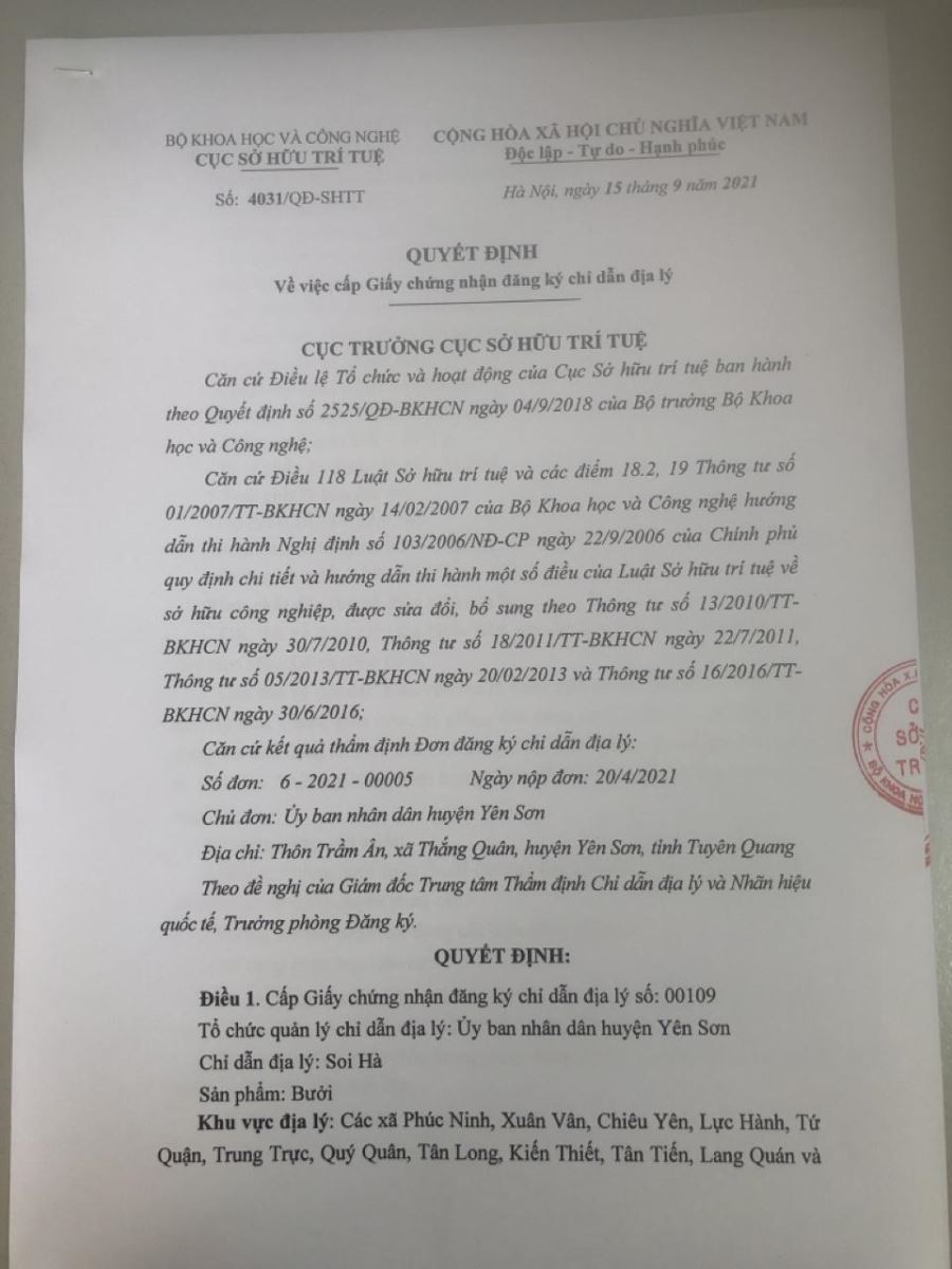 Giấy chứng nhận đăng ký chỉ dẫn địa lý Bưởi Soi Hà Yên SơnThứ tư, ngày 22/09/2021 - 09:19 Đã xem: 836 views Quyết định số 4031/QĐ-SHTT ngày 15/9/2021 của Cục Sở hữu trí tuệ về việc cấp giấy chứng nhận đăng ký chỉ dẫn địa lý Bưởi Soi Hà Trung tâm Xúc tiến đầu tư tỉnh lập đoàn khảo sát tour du lịch online trên ứng dụng Zoom tại 2 huyện Na Hang và Lâm Bình Hướng tới sản phẩm du lịch độc đáo
