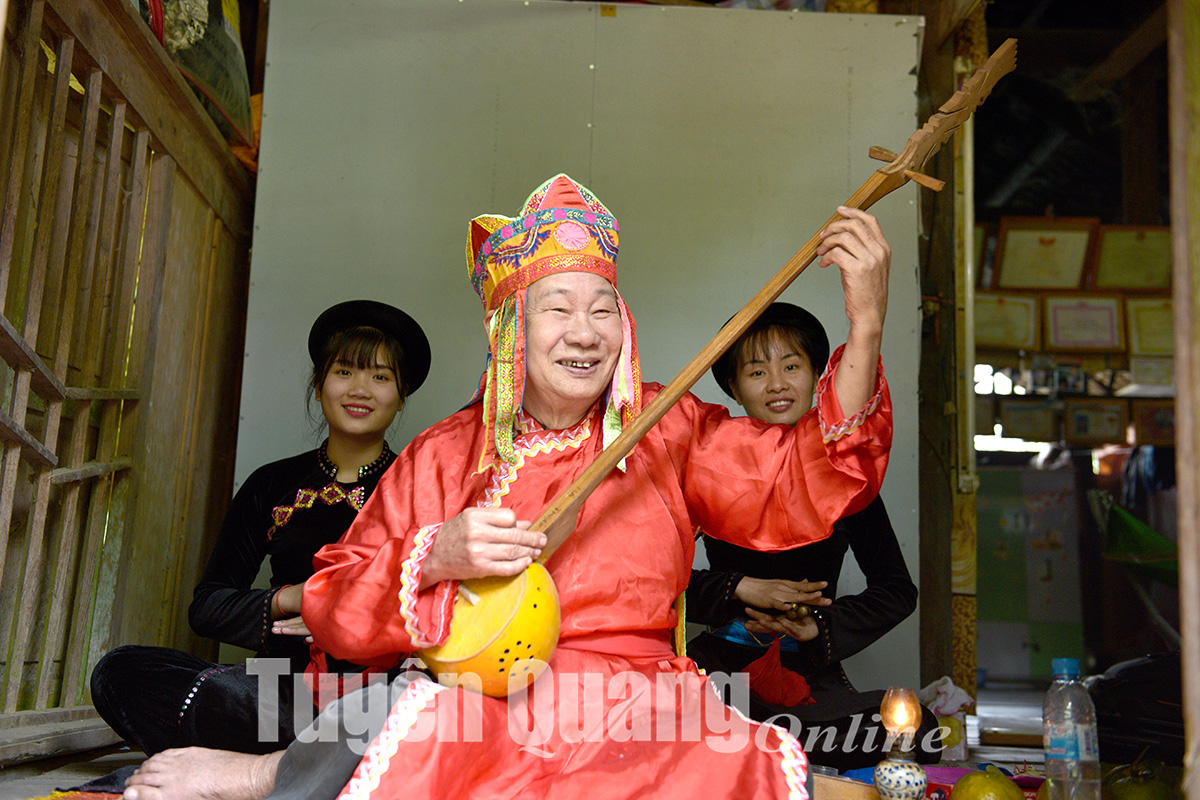 Nghệ nhân nhân dân Hà Thuấn, xã Tân An, Chiêm Hóa biểu diễn Then cổ. Ảnh: Quang Hòa.