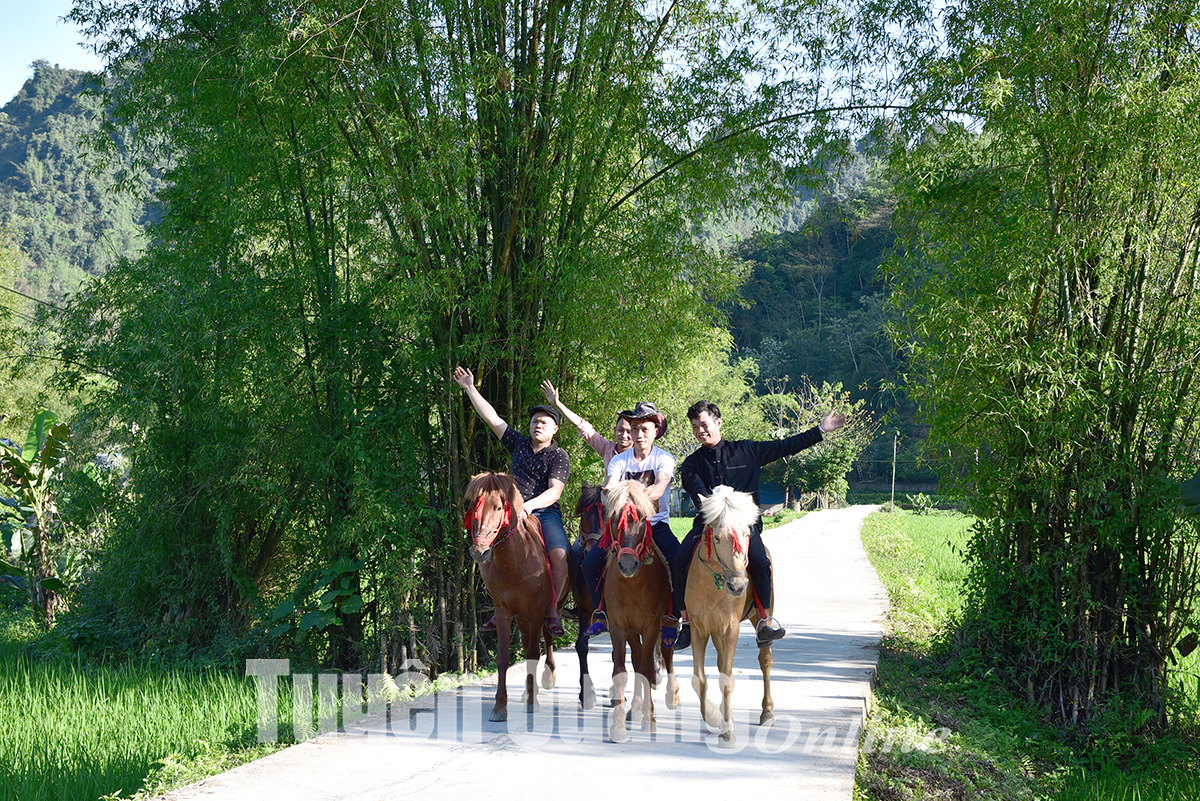 Du khách cưỡi ngựa trải nghiệm homestay ở xã Khuôn Hà, Lâm Bình. Ảnh: Quang Hòa.