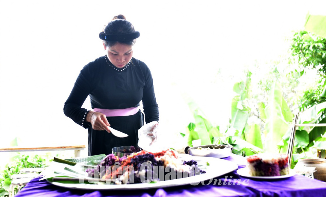 Phụ nữ xã Đà Vị (Na Hang) làm xôi ngũ sắc phục vụ du khách. Ảnh: Quang Hòa