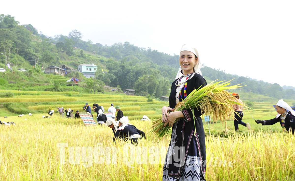 Hoa hậu áo dài Việt Nam 2022 Lương Yến Ly cùng xuống ruộng với bà con trải nghiệm không khí cuộc thi thu hoạch lúa cùng người dân xã Hồng Thái.
