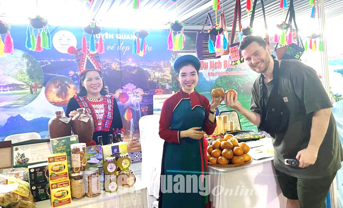 Gian hàng của tỉnh Tuyên Quang trưng bày, giới thiệu ấn phẩm, tờ rơi, tập gấp về du lịch Tuyên Quang, các điểm đến nổi trội, chương trình Năm du lịch và Lễ hội khinh khí cầu Tuyên Quang năm 2023, phong cảnh Quảng trường Nguyễn Tất Thành. Ngoài ra, gian hàng còn trưng bày các sản phẩm OCOP của tỉnh như chè Shan tuyết Hồng Thái, bún khô ngũ sắc Đà Vị, trà gai leo Hợp Hòa, cam sành Hàm Yên, nấm hương Mỹ Bằng, bột sắn dây Thục Sơn, tinh bột nghệ Tiến Phát, miến dong Hợp Thành, mật ong Hương Lâm, Phong Thổ, rượu Chín Chum, Trung Phong…