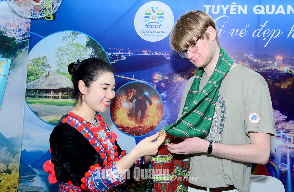 Du khách nước ngoài thích thú với sản phẩm thổ cẩm của Tuyên Quang.