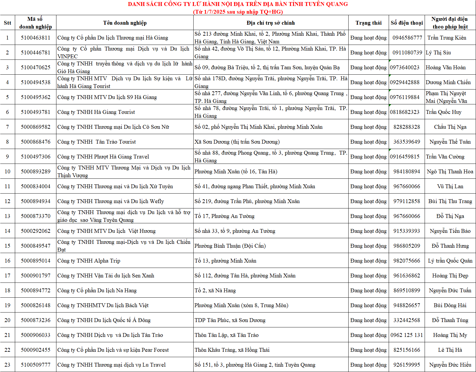 DANH SÁCH CÔNG TY LỮ HÀNH NỘI ĐỊA TRÊN ĐỊA BÀN TỈNH TUYÊN QUANG NĂM 2025Thứ hai, ngày 02/02/2026 - 08:43 Đã xem: 14 views DANH SÁCH CÔNG TY LỮ HÀNH NỘI ĐỊA TRÊN ĐỊA BÀN TỈNH TUYÊN QUANG DANH SÁCH CÔNG TY LỮ HÀNH QUỐC TẾ TRÊN ĐỊA BÀN TỈNH TUYÊN QUANG ĐẾN THÁNG 12/2025 Doanh nghiệp kinh doanh dịch vụ du lịch