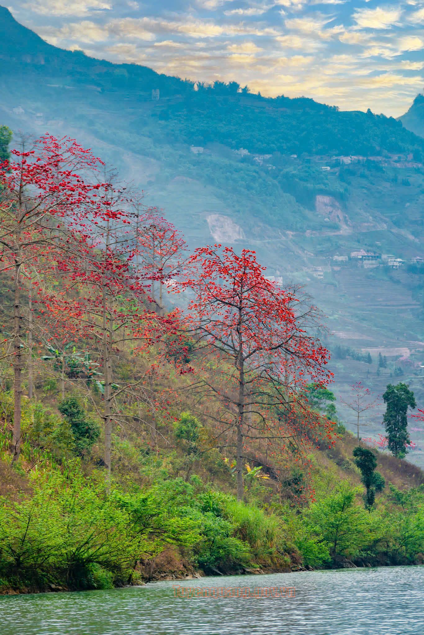 Đặc biệt, khu vực dọc theo lòng hồ thủy điện Nho Quế – nơi được ví như “dải lụa xanh” giữa đại ngàn, là điểm đến lý tưởng để ngắm Hoa Mộc Miên. Từ trên cao nhìn xuống, sắc đỏ của hoa xen lẫn màu xanh ngọc của dòng nước, hòa quyện với màu xám của đá núi, tạo nên một bức tranh sơn thủy hữu tình hiếm có. Ngồi trên thuyền xuôi dòng Nho Quế, du khách có thể cảm nhận trọn vẹn vẻ đẹp ấy, một vẻ đẹp vừa hùng vĩ, vừa nên thơ, cho ta cảm giác khoan thai, bình yên.