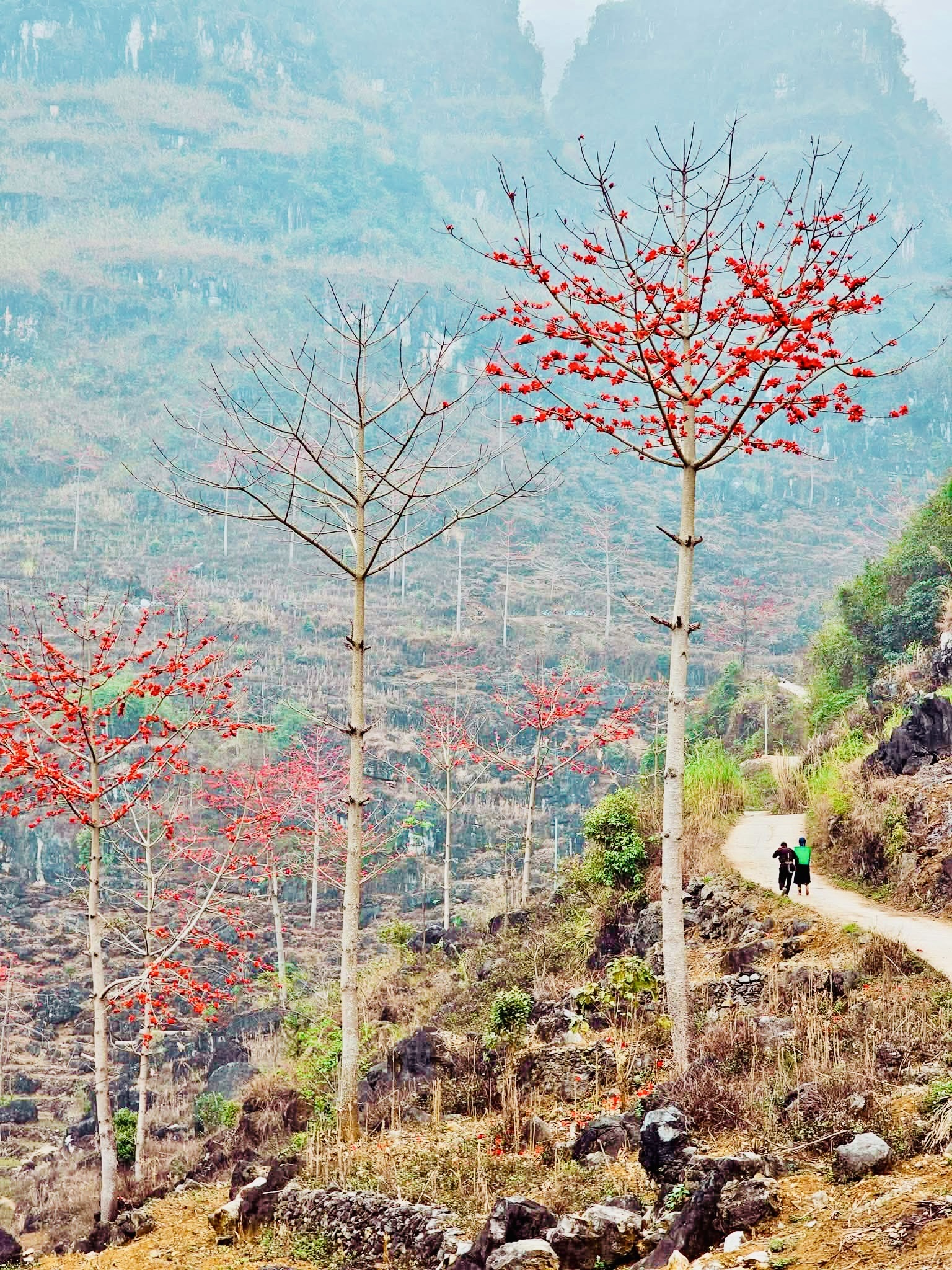 Sắc đỏ mộc miên thắp lửa cho núi đá Cao nguyên đá Đồng Văn, làm ấm cả không gian hoang sơ.