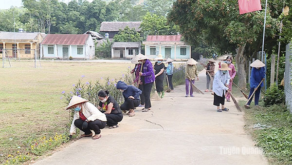 Nhân dân thôn Tông Trang, xã Vinh Quang (Chiêm Hóa) vệ sinh khuôn viên, chăm sóc tuyến đường hoa.