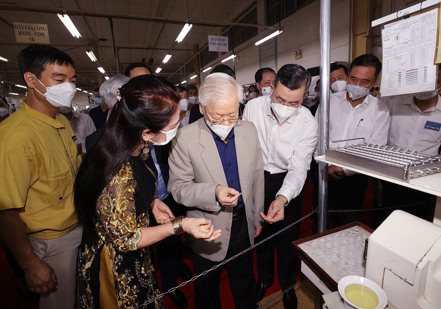 Tổng Bí thư Nguyễn Phú Trọng thăm dây chuyền sản xuất sản phẩm thấu kính quang học cao cấp của Công ty TNHH nghiên cứu kỹ thuật R Việt Nam (tỉnh Hòa Bình) xuất khẩu sang các thị trường Nhật Bản, Malaysia, Đức... _Ảnh: Tư liệu