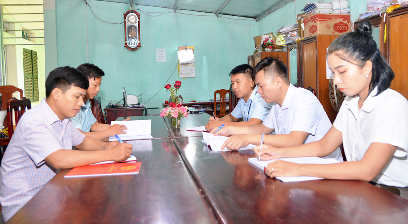 Lãnh đạo Đảng ủy xã Kiến Thiết nghe cán bộ, đảng viên được phân công phụ trách thôn bản báo cáo tình hình cơ sở.