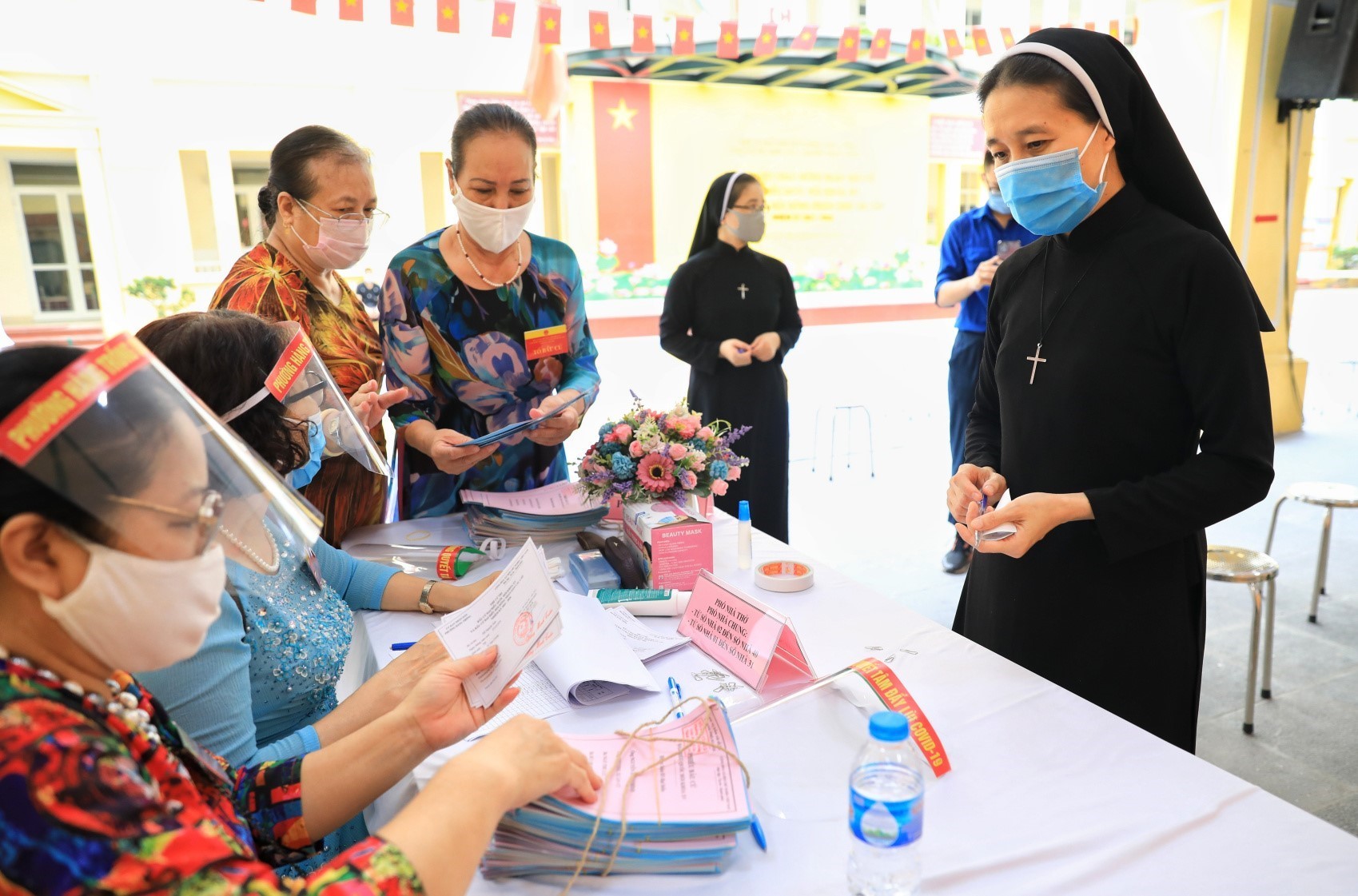 Đồng bào theo đạo nhận phiếu bầu cử đại biểu Quốc hội khóa XV và đại biểu hội đồng nhân dân các cấp nhiệm kỳ 2021 - 2026 tại khu vực bỏ phiếu số 3, phường Hàng Trống, quận Hoàn Kiếm, Hà Nội_Ảnh: TTXVN