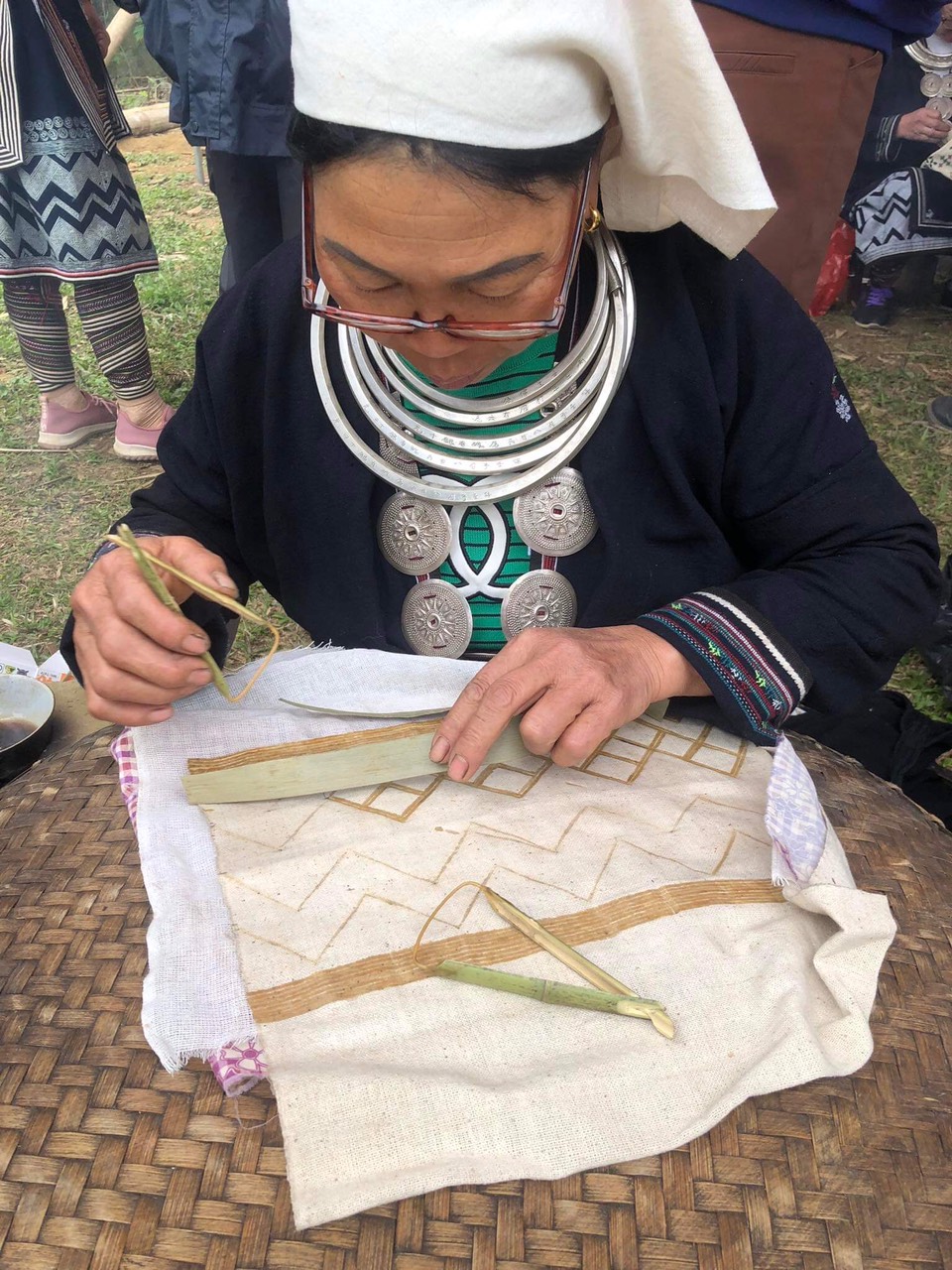 Phụ nữ Dao Tiền (xã Hồng Thái, huyện Na Hang) tại Hội thi Thêu khăn, vẽ áp ong trên trang phục người Dao Tiền