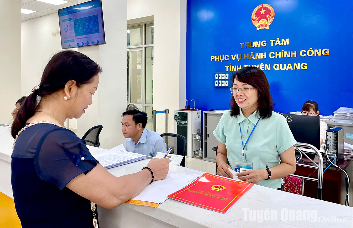 Cán bộ tại Trung tâm Phục vụ hành chính công tỉnh Tuyên Quang vừa tiếp nhận hồ sơ trực tiếp, vừa sẵn sàng hỗ trợ người dân thực hiện trên cổng dịch vụ công trực tuyến.