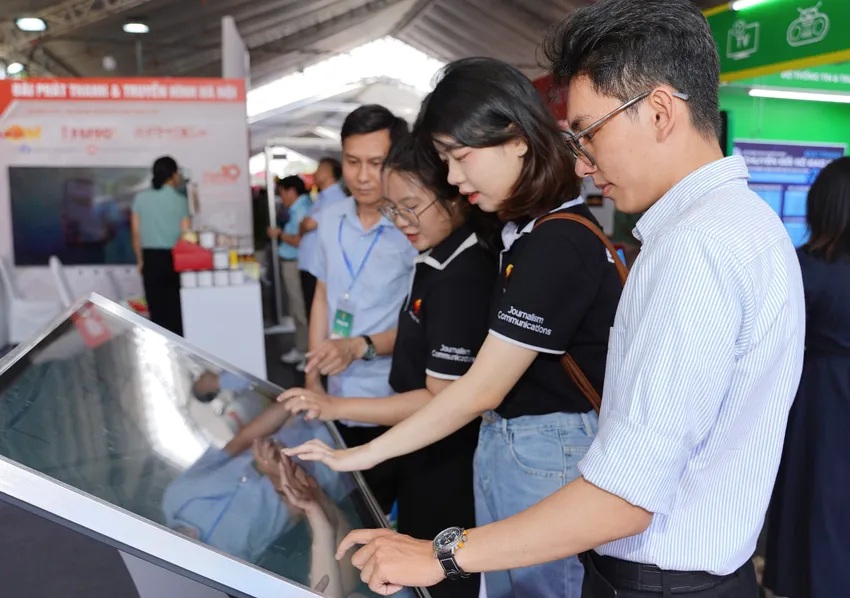 Khách tham quan trải nghiệm không gian làm báo hiện đại tại các gian trưng bày trong Hội Báo toàn quốc 2024_Ảnh: plo.vn