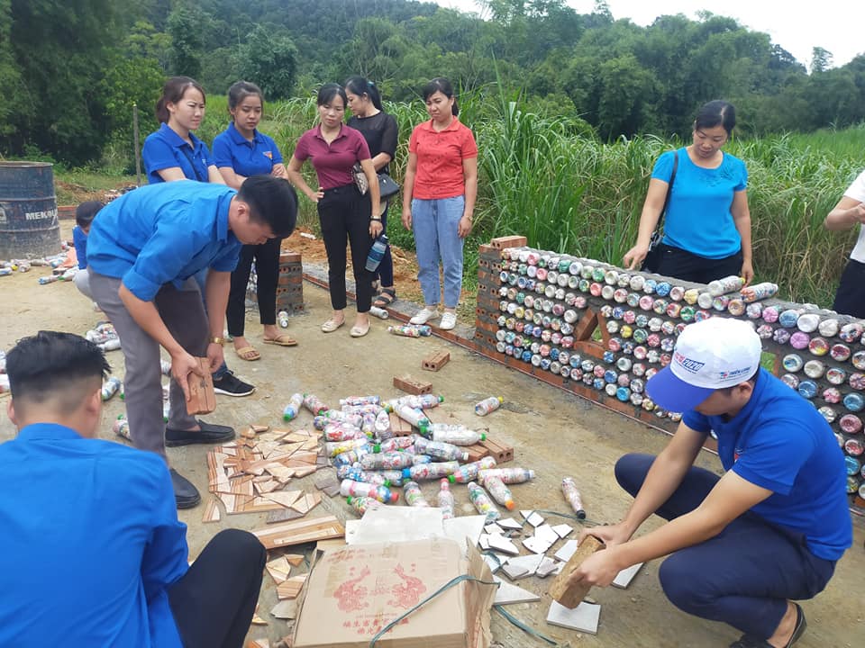 Huyện đoàn Chiêm Hóa phối hợp với Hội Liên Phụ nữ huyện thực hiện thu gom rác thải nhựa để làm gạch sinh thái và xây tường rào, làm bàn, ghế ngoài trời tại nhà văn hóa thôn Cao Bình, xã Hùng Mỹ.