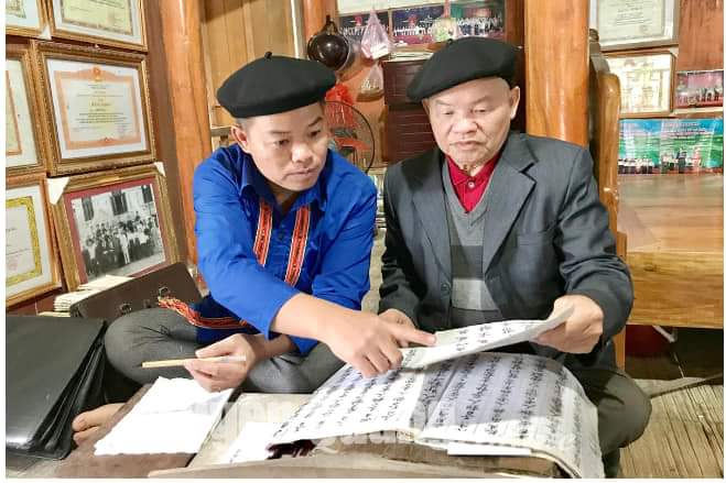 Ông Dừn hướng dẫn học viên nghiên cứu sách cổ về văn hóa Cao Lan