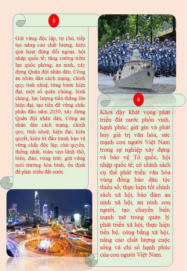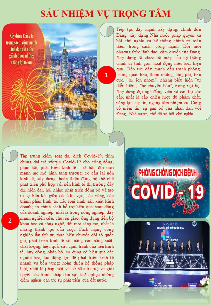 Để thực hiện thắng lợi các mục tiêu đến năm 2025, năm 2030 và đến năm 2045, Đại hội XIII của Đảng đã đề ra 03 đột phá chiến lược, 06 nhiệm vụ trọng tâm