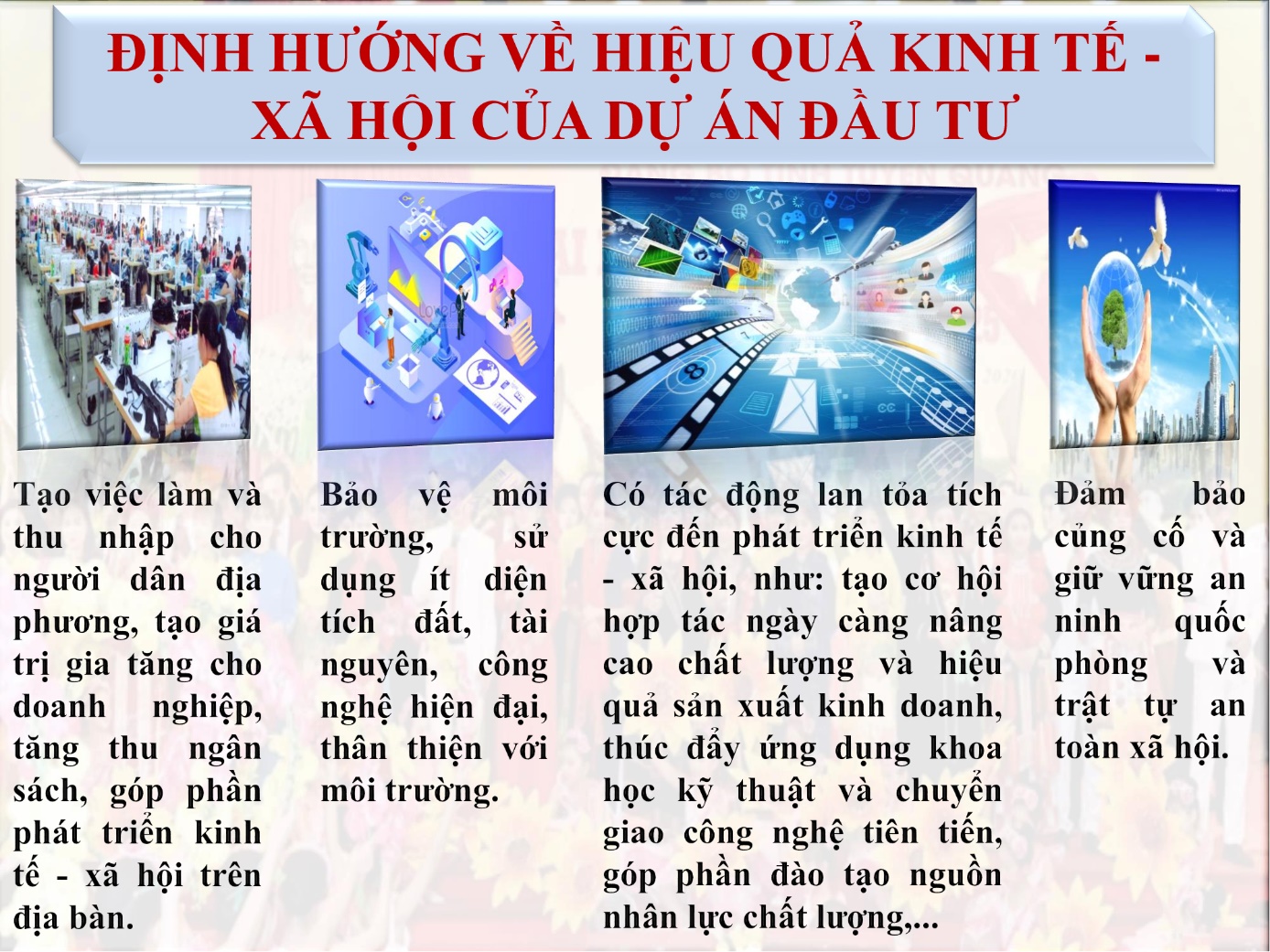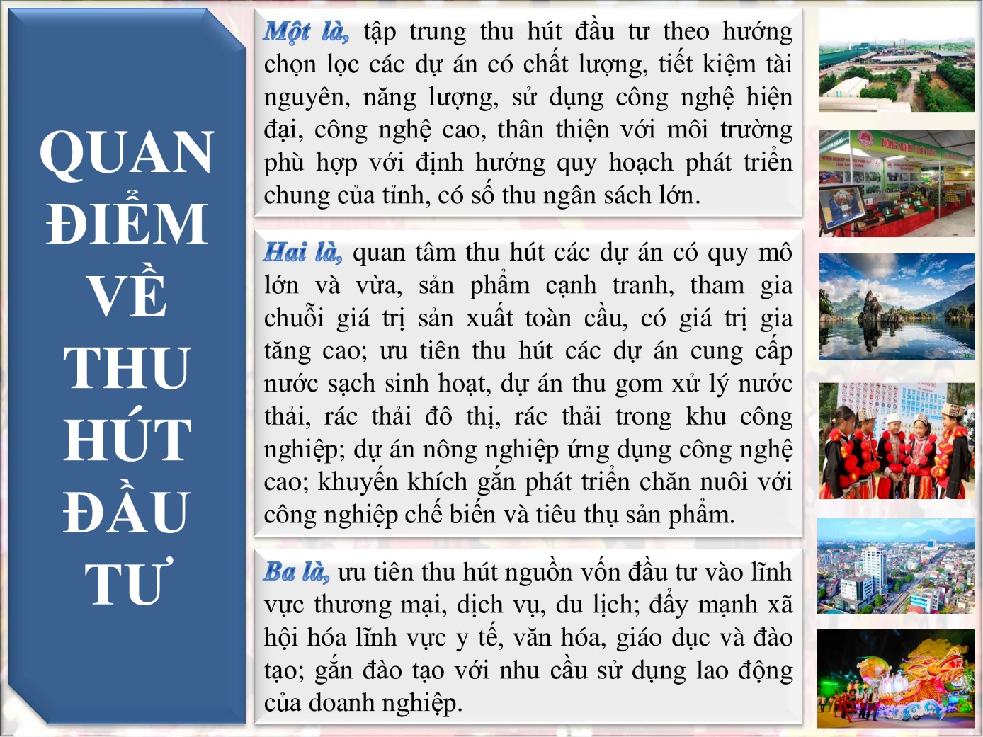 Việc triển khai xây dựng và thực hiện Đề án thu hút đầu tư trên địa bàn tỉnh Tuyên Quang giai đoạn 2021 - 2025 nhằm huy động sức mạnh của cả hệ thống chính trị quyết tâm cải thiện môi trường đầu tư để xây dựng, tạo lập địa chỉ hấp dẫn, tin cậy, là điểm đến an toàn cho các nhà đầu tư trong nước và nước ngoài.