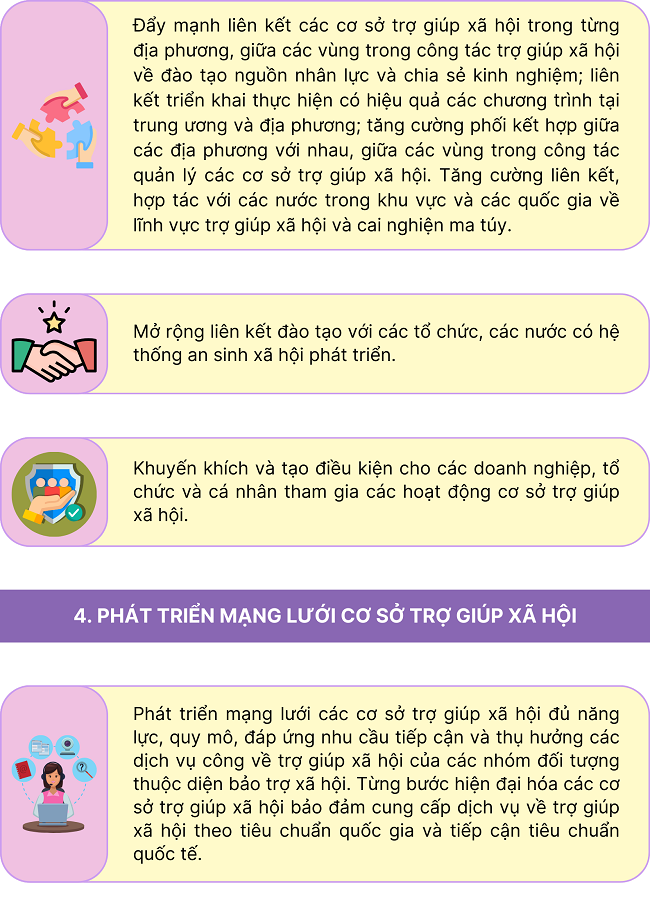 Ngày 16/12/2024, Thủ tướng Chính phủ ban hành Quyết định số 1575/QĐ-TTg phê duyệt Kế hoạch thực hiện Quy hoạch mạng lưới cơ sở trợ giúp xã hội thời kỳ 2021 - 2030, tầm nhìn đến năm 2050 với giải pháp như sau: