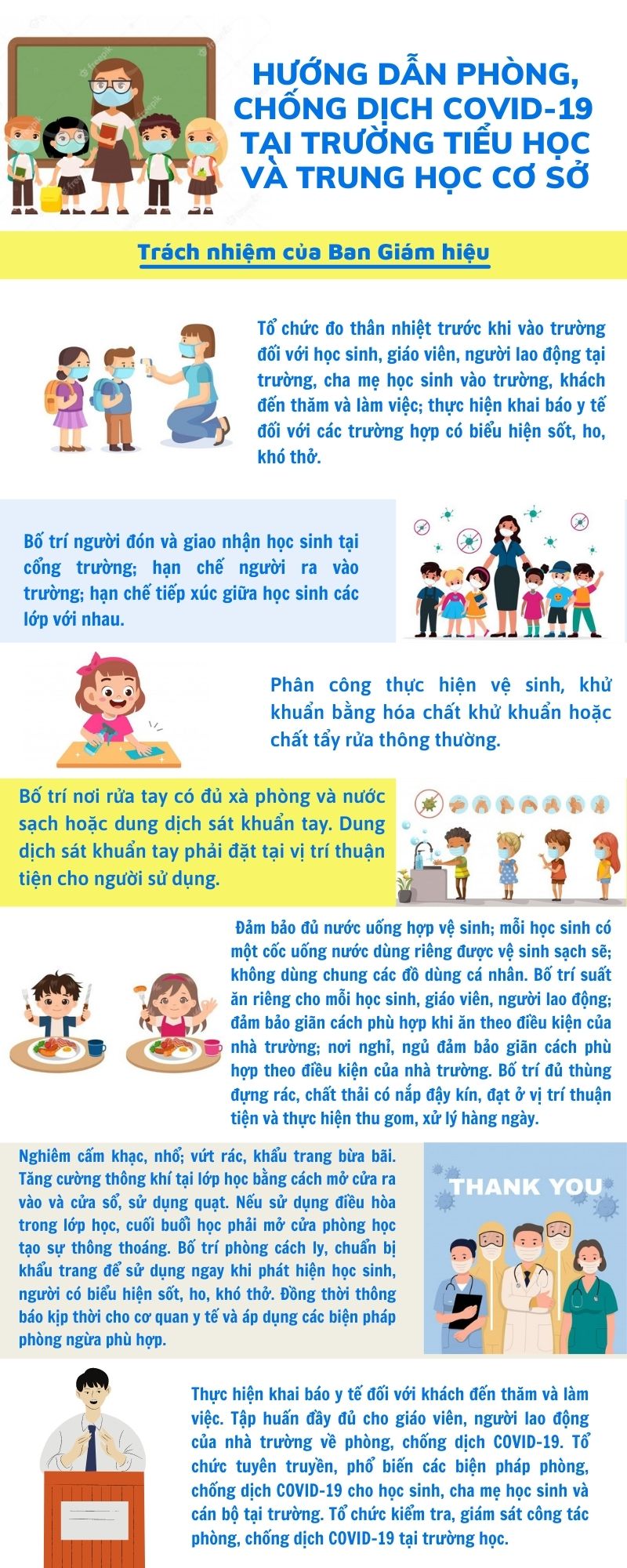 Trước diễn biến và tình hình phức tạp của dịch Covid-19 như hiện nay, việc đảm bảo về sức khoẻ cho học sinh tại trường học là vấn đề hết sức quan trọng. Để trẻ trong độ tuổi học sinh Tiểu học và Trung học cơ sở đến trường an toàn trước dịch bệnh, Bộ Y tế đã ban hành Sổ tay Hướng dẫn công tác phòng, chống dịch Covid-19 tại các cơ sở giáo dục trong tình hình mới; trong đó nêu rõ trách nhiệm của Ban Giám hiệu, cán bộ, giáo viên, cha mẹ và học sinh cần thực hiện tại trường Tiểu học và Trung học cơ sở .