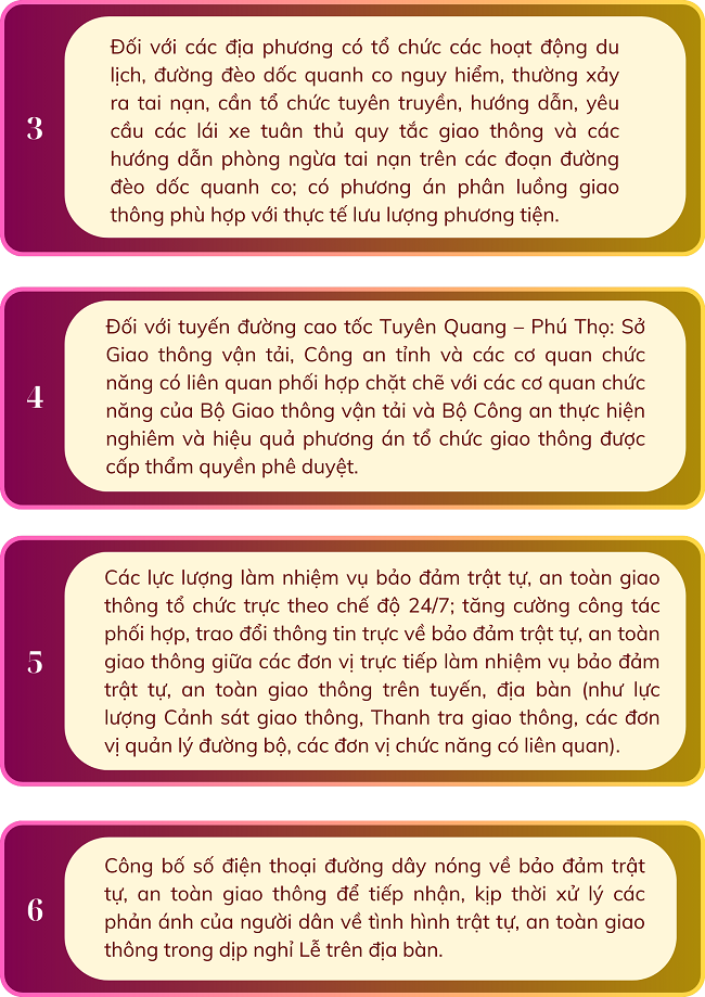 Một số nhiệm vụ bảo đảm trật tự, an toàn giao thông dịp nghỉ lễ 30/4 - 01/5 và cao điểm du lịch hè 2024 trên địa bàn tỉnh Tuyên Quang