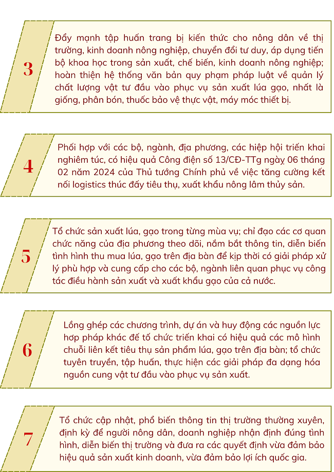 Để đảm bảo hoạt động sản xuất, kinh doanh, xuất khẩu lúa gạo lành mạnh, minh bạch, phản ứng linh hoạt, kịp thời trong tình hình thị trường có nhiều biến động, hướng đến phát triển ngành lúa gạo bền vững, hiệu quả cao, nâng cao thu nhập cho người trồng lúa, ngày 02/3/2024 Thủ tướng Chính phủ ban hành Chỉ thị số 10/CT-TTg về việc đẩy mạnh sản xuất, kinh doanh, xuất khẩu lúa, gạo bền vững, minh bạch, hiệu quả trong tình hình mới với một số nhiệm vụ như sau: