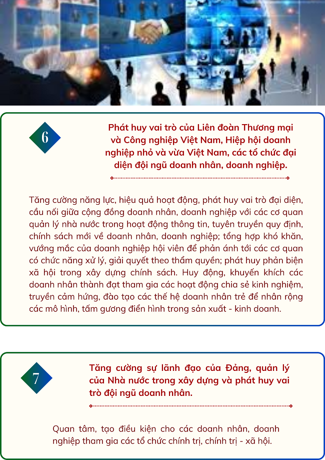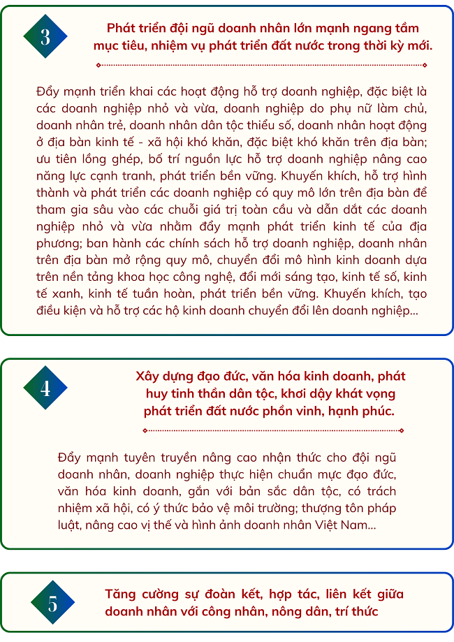 Ngày 09/5/2024 Chính phủ ban hành Nghị quyết số 66/NQ-CP Ban hành Chương trình hành động của Chính phủ thực hiện Nghị quyết số 41-NQ/TW ngày 10 tháng 10 năm 2023 của Bộ Chính trị về xây dựng và phát huy vai trò của đội ngũ doanh nhân Việt Nam trong thời kỳ mới với một số nhiệm vụ và giải pháp như sau: