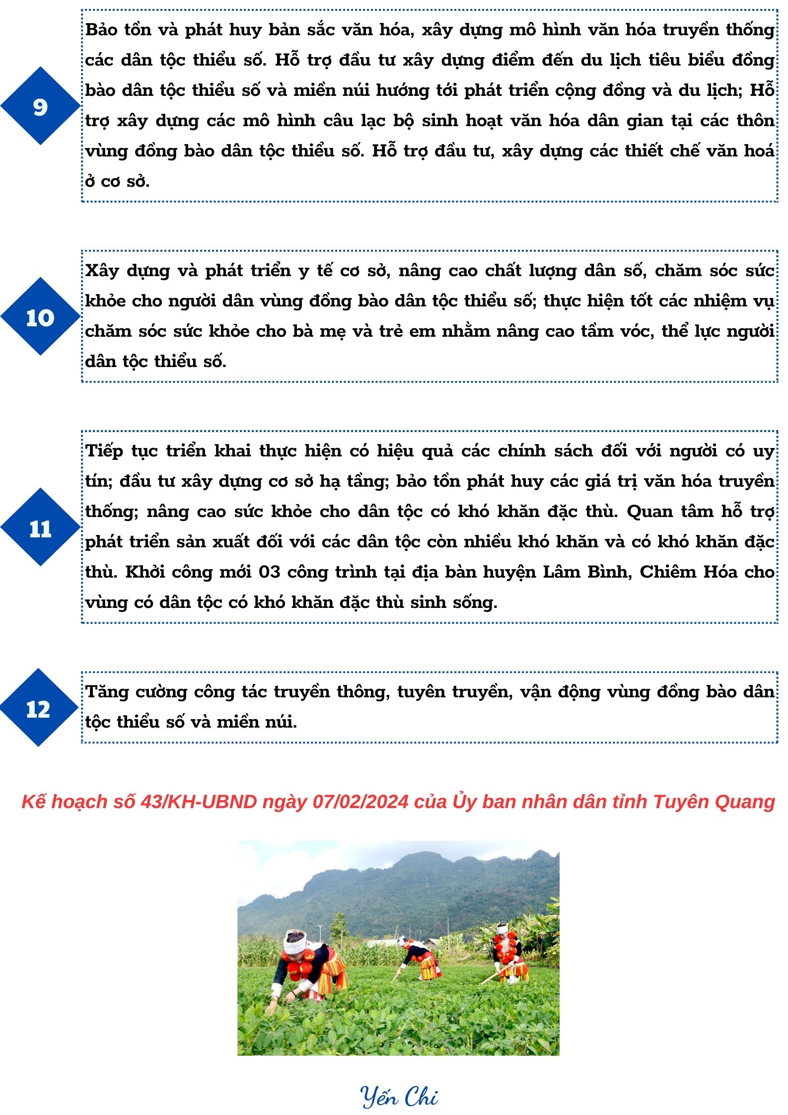 Ngày 07/02/2024 Ủy ban nhân dân tỉnh Tuyên Quang ban hành Kế hoạch số 34/KH-UBND thực hiện Chương trình mục tiêu quốc gia phát triển kinh tế - xã hội vùng đồng bào dân tộc thiểu số và miền núi năm 2024 trên địa bàn tỉnh Tuyên Quang với mục tiêu cụ thể như sau: