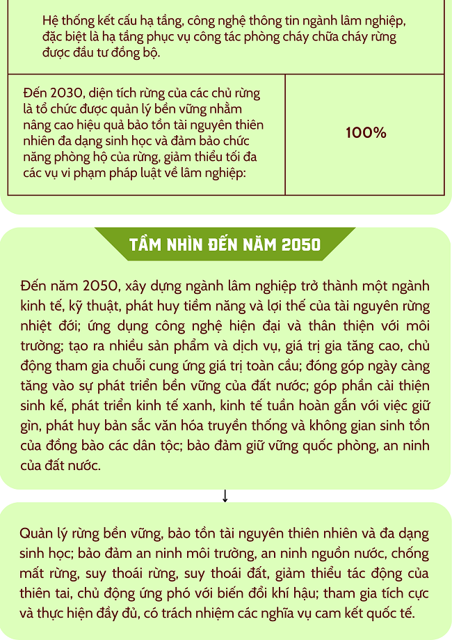 Ngày 24/8/2024 Thủ tướng Chính phủ ban hành Quyết định số 895/QĐ-TTg về Phê duyệt Quy hoạch lâm nghiệp quốc gia thời kỳ 2021 – 2030, tầm nhìn đến năm 2050, với mục tiêu tổng quát, cụ thể và tầm nhìn đến năm 2050 như sau: