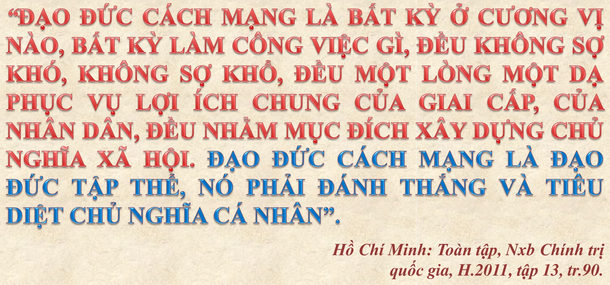 Như vậy, theo Chủ tịch Hồ Chí Minh đạo đức cách mạng là "cái gốc'' cái căn bản của người cách mạng. Người cách mạng phải có đạo đức cách mạng làm nền tảng mới hoàn thành được nhiệm vụ, làm tròn vai trò người lãnh đạo, người đầy tớ trung thành, tận tuỵ của nhân dân. Mới biết đặt lợi ích của Đảng, của dân tộc lên trên hết, trước hết, suốt đời phấn đấu hy sinh vì độc lập, tự do của Tổ quốc, vì chủ nghĩa xã hội, vì hạnh phúc của nhân dân.