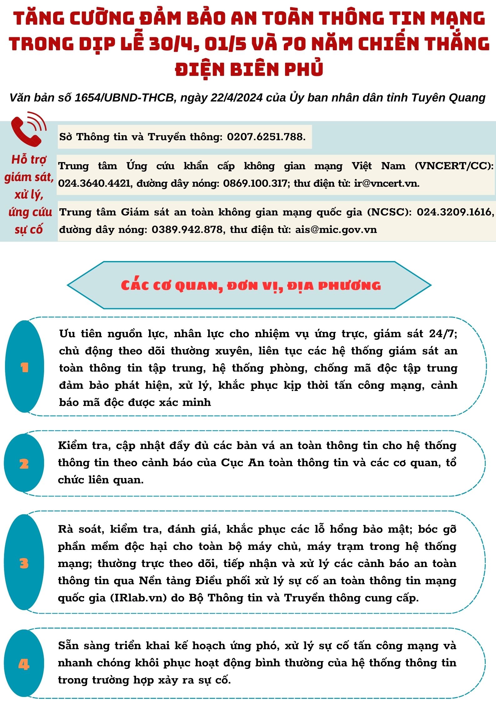 Theo Văn bản số 1654/UBND-THCB, ngày 22/4/2024 của Ủy ban nhân dân tỉnh Tuyên Quang về việc tăng cường bảo đảm an toàn thông tin mạng trong dịp Lễ 30/4, 01/5 và 70 năm chiến thắng Điện Biên Phủ