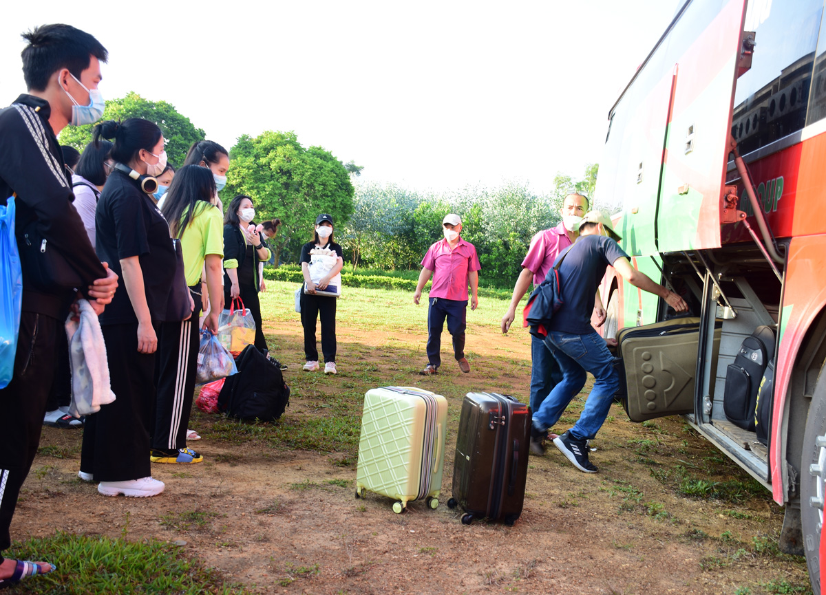 Các công dân chuẩn bị lên xe về địa phương sau khi hoàn thành cách ly 14 ngày.