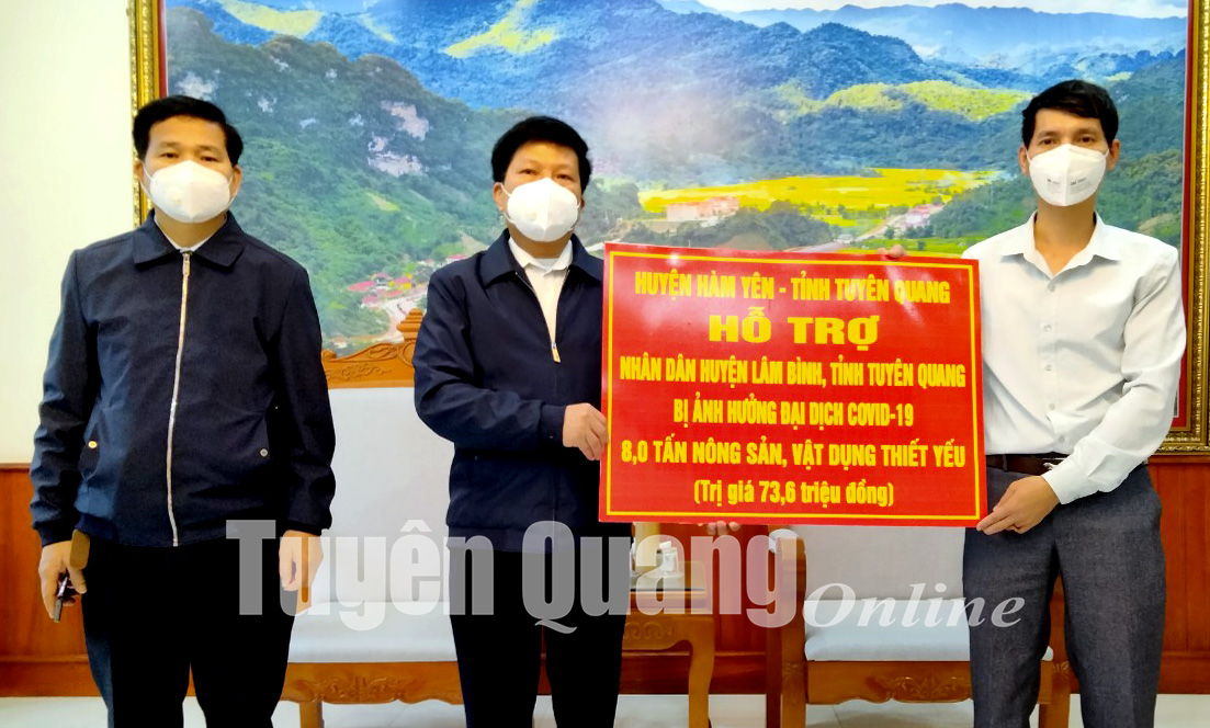 Trong đó, HĐND, UBND, Ủy ban MTTQ huyện Chiêm Hóa trao hỗ trợ 100 triệu đồng; Mặt trận Tổ quốc huyện Hàm Yên đã tiếp nhận và trao 8 tấn nông sản, cùng các vật dụng thiết yếu gồm: 5 tấn cam; 1 tấn gạo; 2 tấn rau, bí, khoai tây; cùng các vật dụng khác như xô, chậu, cốc… tổng trị giá 73,6 triệu đồng; trường THCS Lê Quý Đôn (TP Tuyên Quang) ủng hộ hơn 400 hộp khẩu trang, gần 200 chăn ấm và gối, 96 thùng mì tôm, 82 thùng nước lọc và nhu yếu phẩm thiết yếu khác như: dung dịch sát khuẩn, dầu ăn, bột canh, bột mì, gạo, bánh kẹo... tổng giá trị hơn 100 triệu đồng.