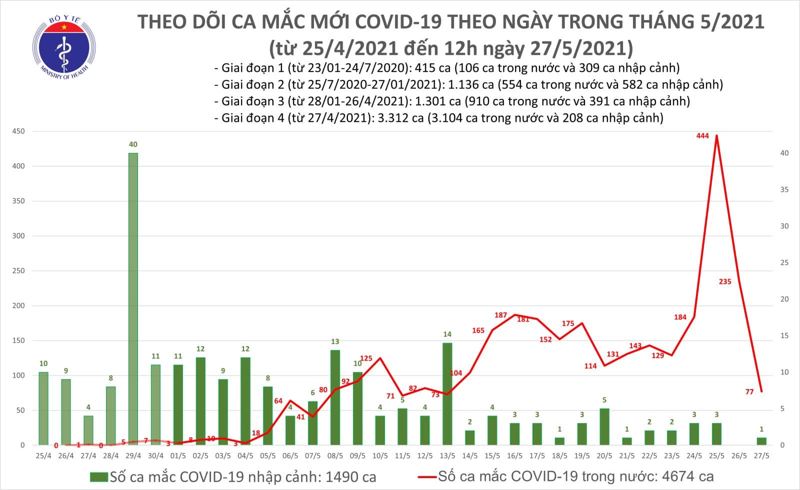 - Việt Nam có tổng cộng 4.674 ca ghi nhận trong nước và 1.490 ca nhập cảnh.