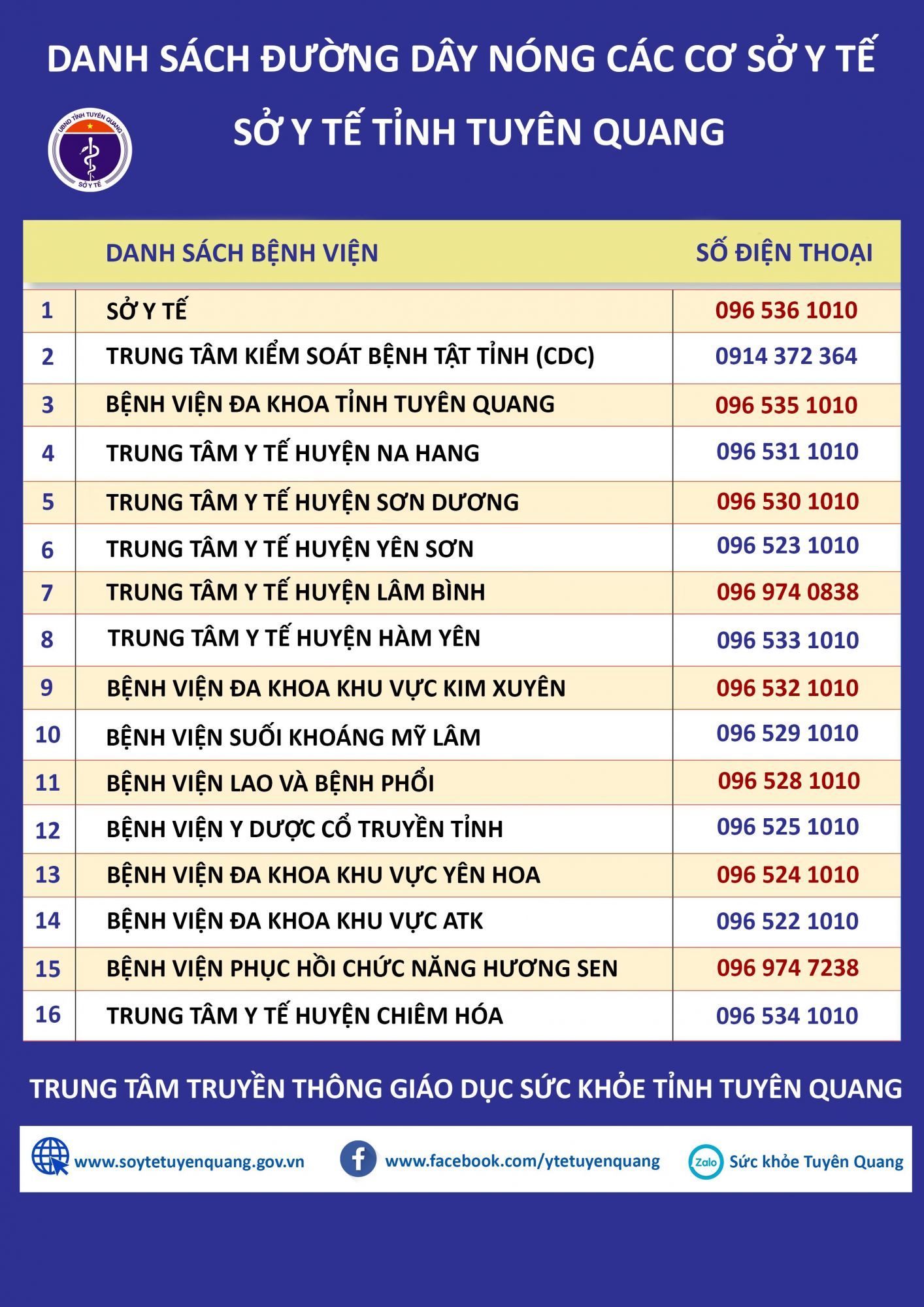 Ban chỉ đạo phòng chống dịch COVID-19 Sở Y tế tỉnh Tuyên Quang thường trực 24/24 để ứng phó tốt nhất với tình trạng khẩn cấp của dịch. Vì sức khỏe của chính bản thân bạn, gia đình và cộng đồng, mọi người dân khi phát hiện, nghi ngờ người có các biểu hiện sốt, ho, khó thở ...hãy báo cho cơ sở Y tế gần nhất hoặc gọi điện thoại đường dây nóng: 0965 361 010 hoặc danh sách danh bạ dưới đây để được hướng dẫn xử lý kịp thời.