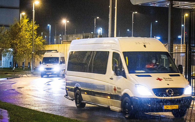 Chuyển các hành khách có xét nghiệm dương tính với Covid-19 trên chuyến bay từ Nam Phi đến sân bay Schiphol ở Amsterdam (Hà Lan) tới khu cách ly. Ảnh AFP/TTXVN