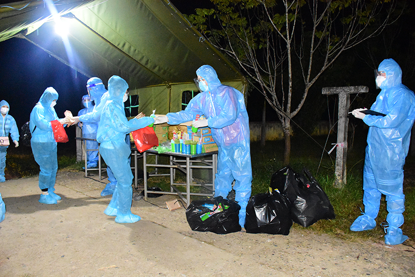 Lực lượng làm việc tại khu cách ly phát đồ dùng cá nhân cho các công dân.