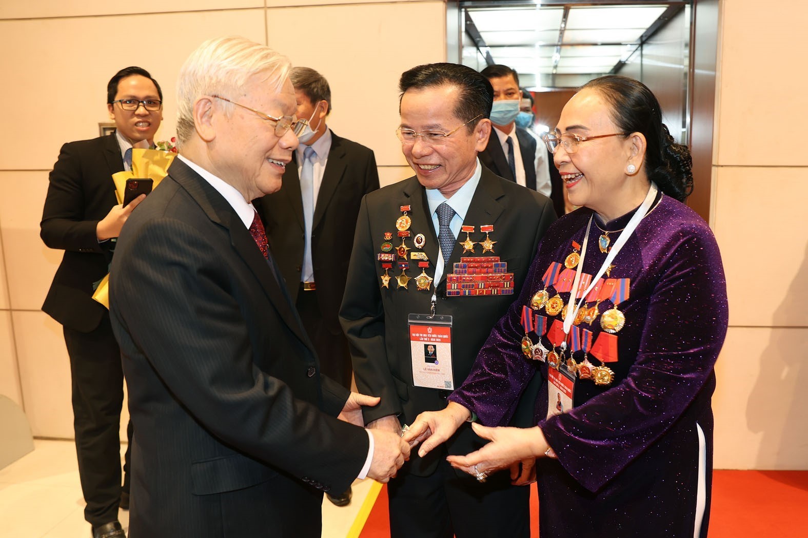 Tổng Bí thư, Chủ tịch nước Nguyễn Phú Trọng với các đại biểu là Anh hùng Lao động, cựu chiến binh tại Đại hội Thi đua yêu nước toàn quốc lần thứ X, tháng 12-2020_Ảnh: TTXVN