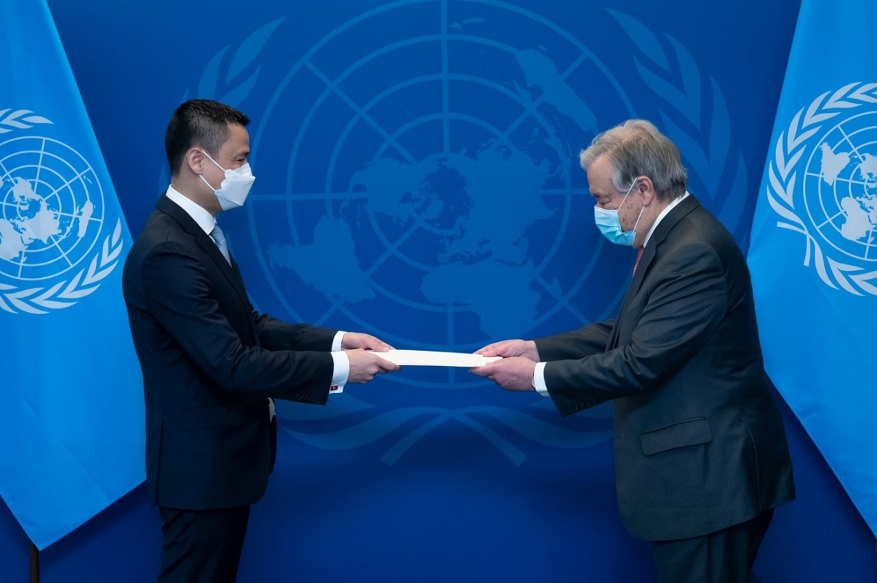 Đại sứ Đặng Hoàng Giang, Trưởng Phái đoàn Thường trực Việt Nam tại Liên hợp quốc trình Thư ủy nhiệm của Ủy viên Bộ Chính trị, Chủ tịch nước Nguyễn Xuân Phúc lên Tổng Thư ký Liên hợp quốc Antonio Guterres_Ảnh: Tư liệu