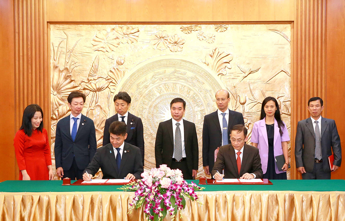 Ủy viên Trung ương Đảng, Trưởng Ban Đối ngoại Trung ương Lê Hoài Trung và Chủ tịch Đảng Dân chủ Lập hiến Nhật Bản Izumi Kenta ký bản ghi nhớ hợp tác giữa hai Đảng, tháng 8-2023_Ảnh: TTXVN