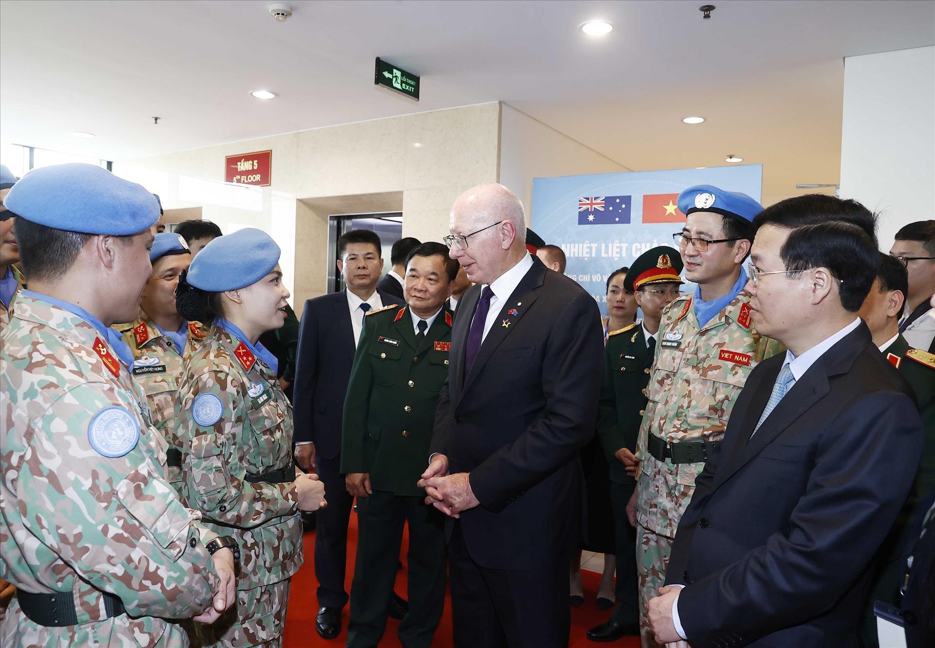Ủy viên Bộ Chính trị, Chủ tịch nước Võ Văn Thưởng và Toàn quyền Australia David Hurley gặp gỡ các sĩ quan của Cục Gìn giữ hoà bình Việt Nam_Ảnh: TTXVN