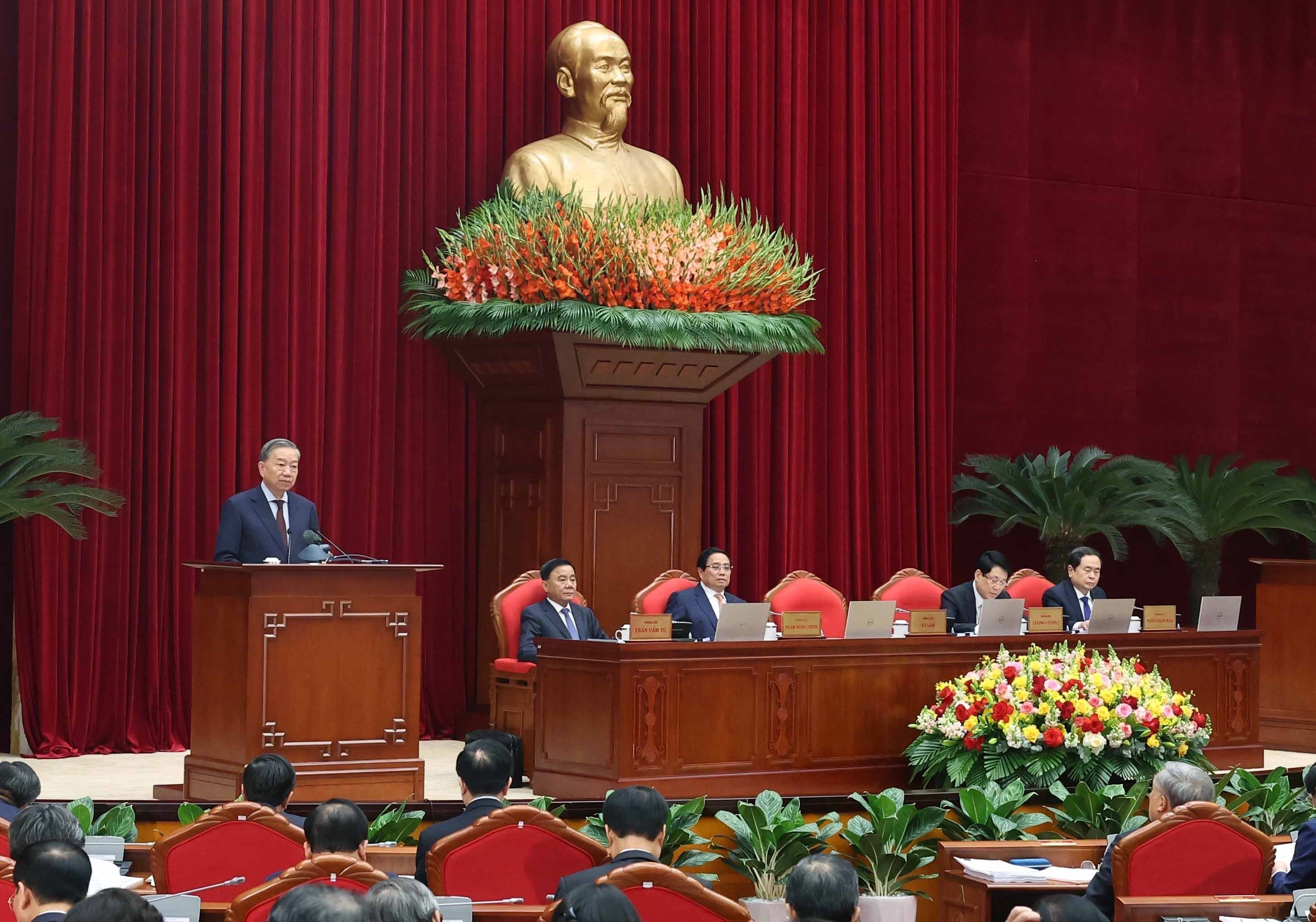 Tổng Bí thư Tô Lâm phát biểu khai mạc Hội nghị Ban Chấp hành Trung ương Đảng khoá XIII, ngày 23-1-2025, trong đó có bàn tới việc tiếp tục đổi mới, sắp xếp tổ chức bộ máy của hệ thống chính trị tinh gọn, hoạt động hiệu lực, hiệu quả_Ảnh: TTXVN