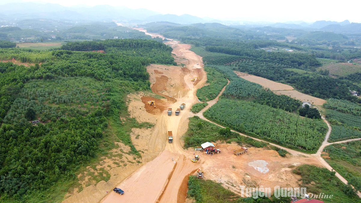 Hiện nay, các nhà thầu tập trung xẻ đồi, vượt sông mở đường tạo mặt bằng thi công với khối lượng đào đắp hàng triệu m3 đất, đá. Tại Km23, đoạn qua xã Tứ Quận (Yên Sơn) hàng chục phương tiện cơ giới cùng cả trăm công nhân được huy động san gạt tạo mặt bằng. Đoạn tuyến này hiện đang giai đoạn mở đường, san đắp nền. Một số hạng mục khác như cống ngầm, hầm cầu chui dân sinh trên tuyến cũng đang được thi công. Tuy nhiên, khó khăn hiện nay, trên toàn tuyến đường đang thiếu khối lượng lớn đất đắp nền, do vướng các quy định liên quan.