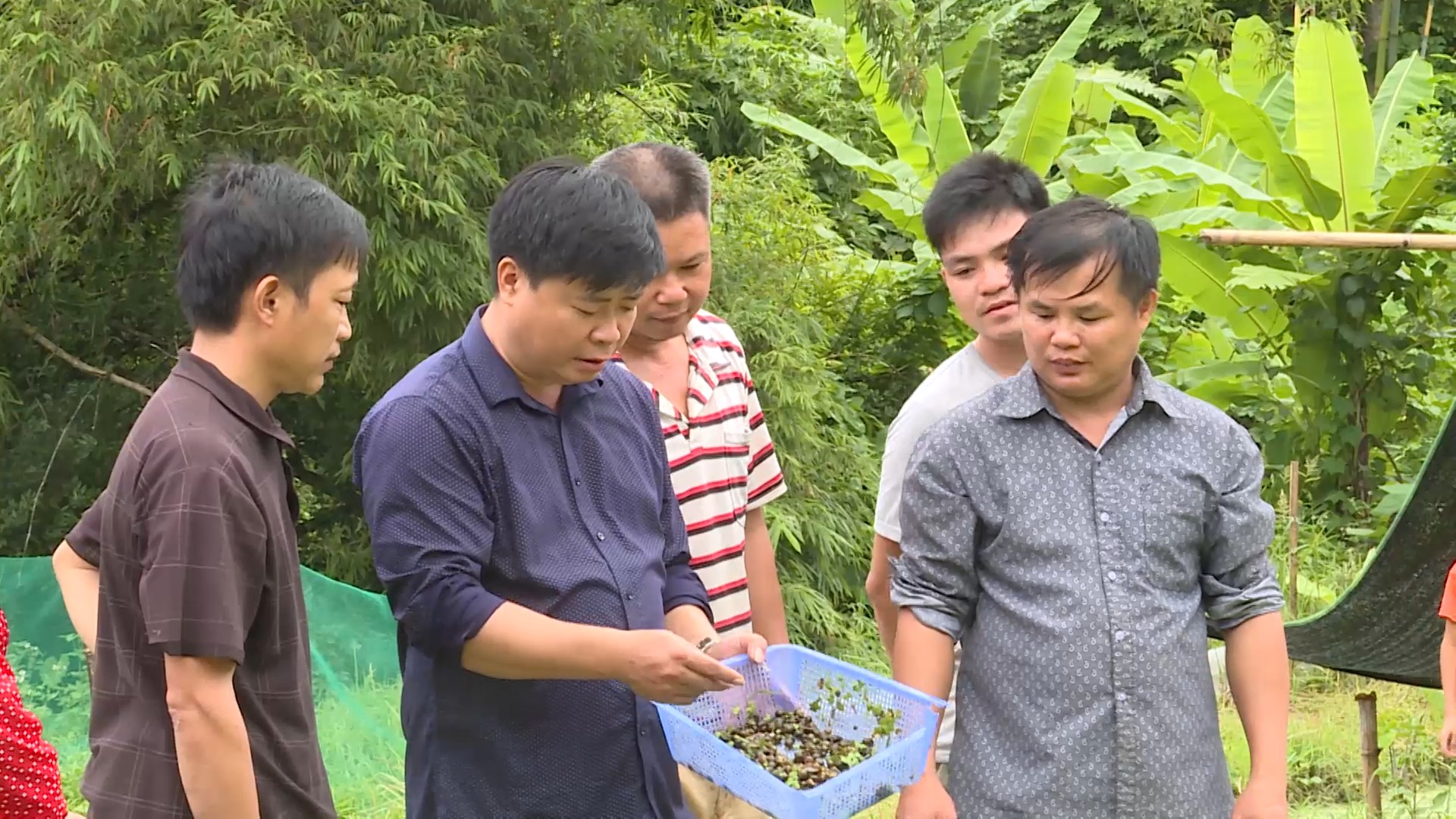 Đồng chí Triệu Phúc Phương (thứ 2 từ trái sang) trao đổi với bà con về kỹ thuật nuôi ốc nhồi ta đạt hiệu quả cao