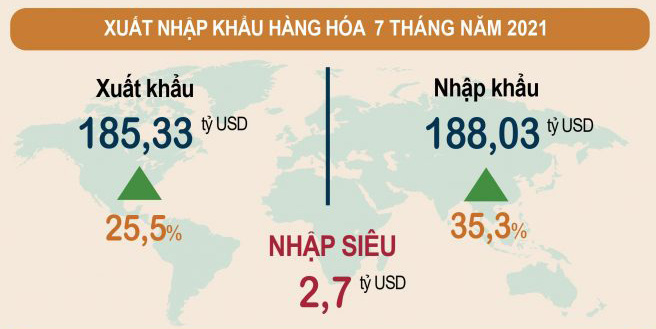 Cán cân thương mại hàng hóa thực hiện tháng 7 ước tính nhập siêu 1,7 tỷ USD. Tính chung 7 tháng năm 2021, cán cân thương mại hàng hóa nhập siêu 2,7 tỷ USD (cùng kỳ năm trước xuất siêu 8,69 tỷ USD), trong đó khu vực kinh tế trong nước nhập siêu 17,8 tỷ USD; khu vực có vốn đầu tư nước ngoài (kể cả dầu thô) xuất siêu 15,1 tỷ USD.