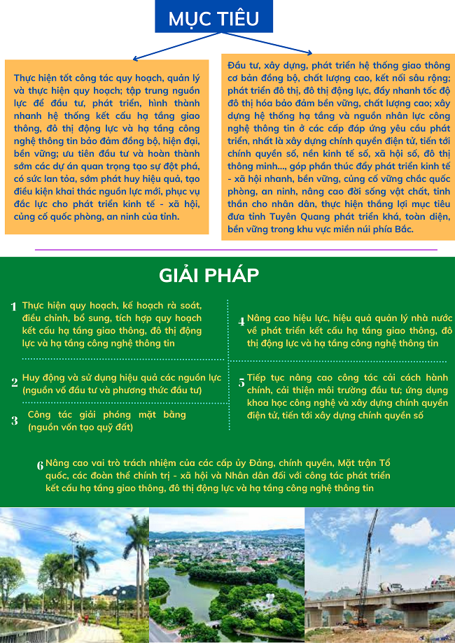 Để thực hiện phát triển kết cấu hạ tầng giao thông, đô thị động lực và hạ tầng công nghệ thông tin, Ủy ban nhân tân tỉnh ban hành Đề án: phát triển kết cấu hạ tầng giao thông, đô thị động lực và hạ tầng công nghệ thông tin tỉnh Tuyên Quang giai đoạn 2021 - 2025 (ban hành kèm theo Quyết định số 559/QĐ-UBND ngày 10/9/2021 của Ủy ban nhân dân tỉnh) với quan điểm, mục tiêu, giải pháp cụ thể: