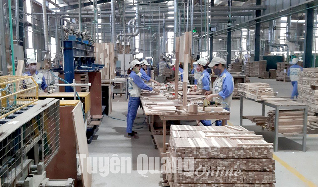Công nhân Nhà máy chế biến gỗ Yên Sơn (Công ty cổ phần Woodsland Tuyên Quang) sản xuất gỗ thanh xuất khẩu.