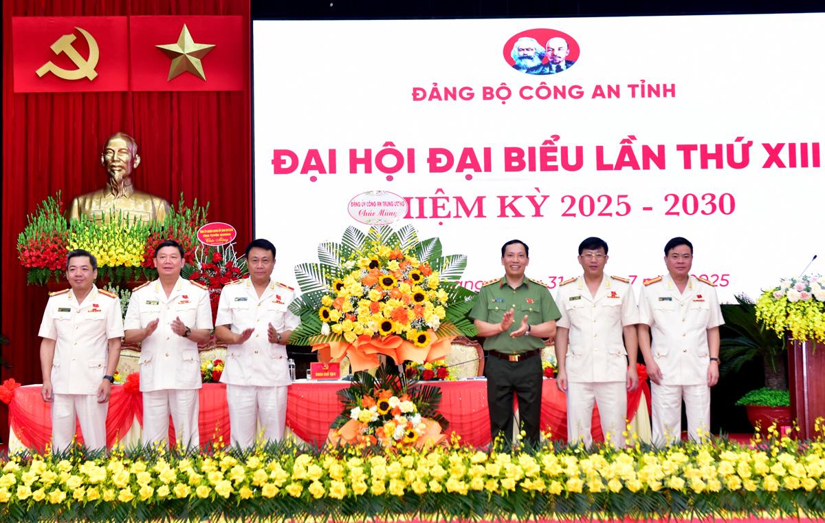 | Đồng chí Bí thư Tỉnh uỷ Hầu A Lềnh tặng hoa chúc mừng Đại hội đại biểu Đảng bộ Công an tỉnh lần thứ XIII, nhiệm kỳ 2025–2030. |