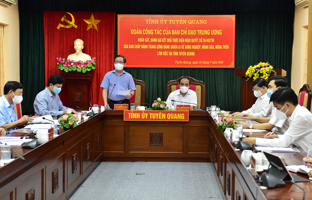 Tiếp tục chương trình làm việc, chiều 13-7, Đoàn công tác của Ban Chỉ đạo Trung ương do đồng chí Lương Quốc Đoàn, Ủy viên BCH Trung ương Đảng, Chủ tịch Trung ương Hội Nông dân Việt Nam làm Trưởng đoàn đã làm việc với lãnh đạo tỉnh về thực hiện Nghị quyết số 26-NQ/TW, ngày 5-8-2008 của BCH Trung ương (khóa X) về nông nghiệp, nông dân, nông thôn.