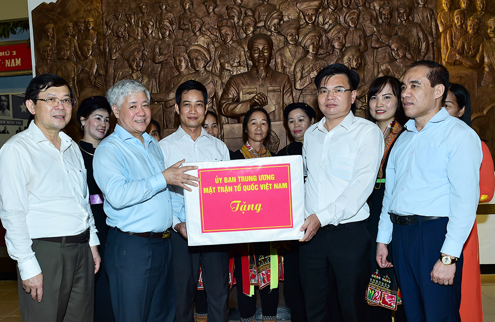 Đồng chí Chủ tịch Ủy ban Trung ương MTTQ Việt Nam Đỗ Văn Chiến tặng quà cán bộ xã Trung Yên.