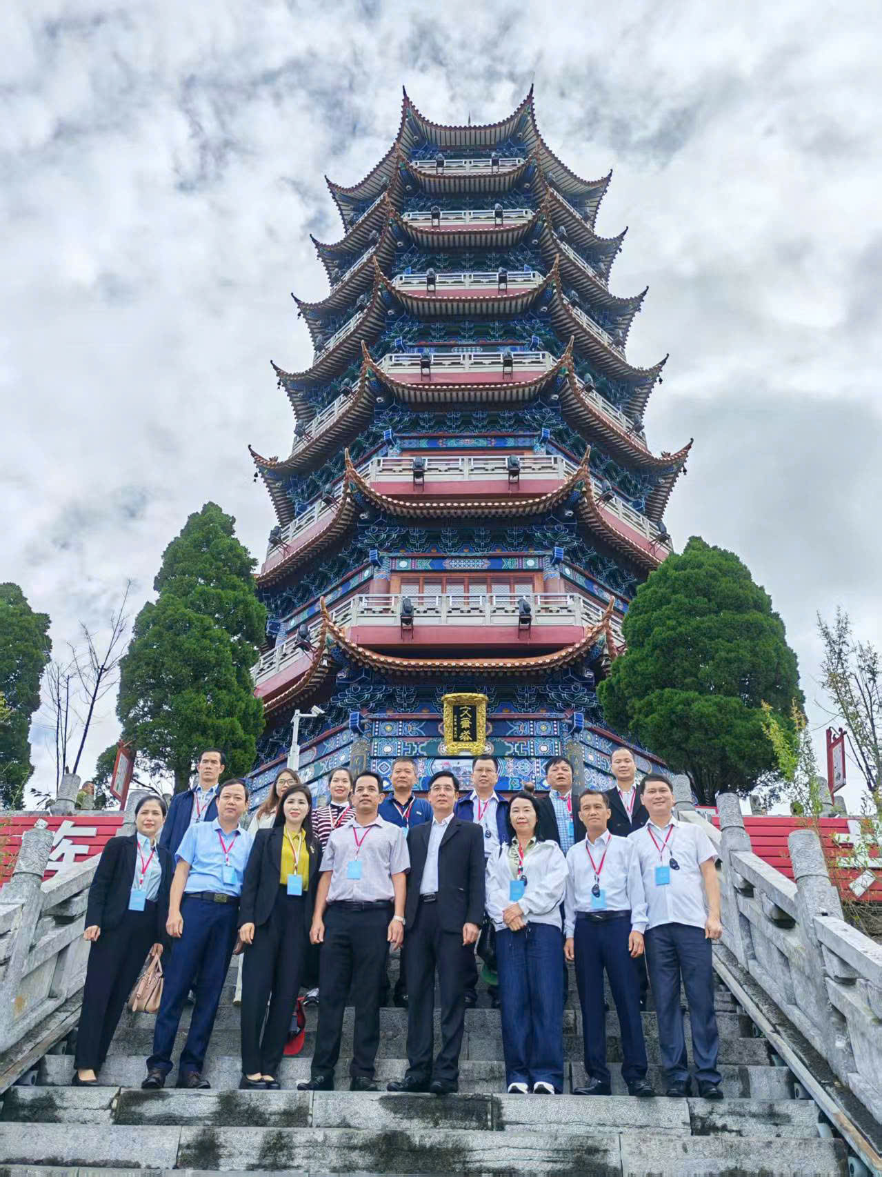 Đoàn công tác chụp ảnh lưu niệm tại Tháp Văn Bút, thành phố Văn Sơn